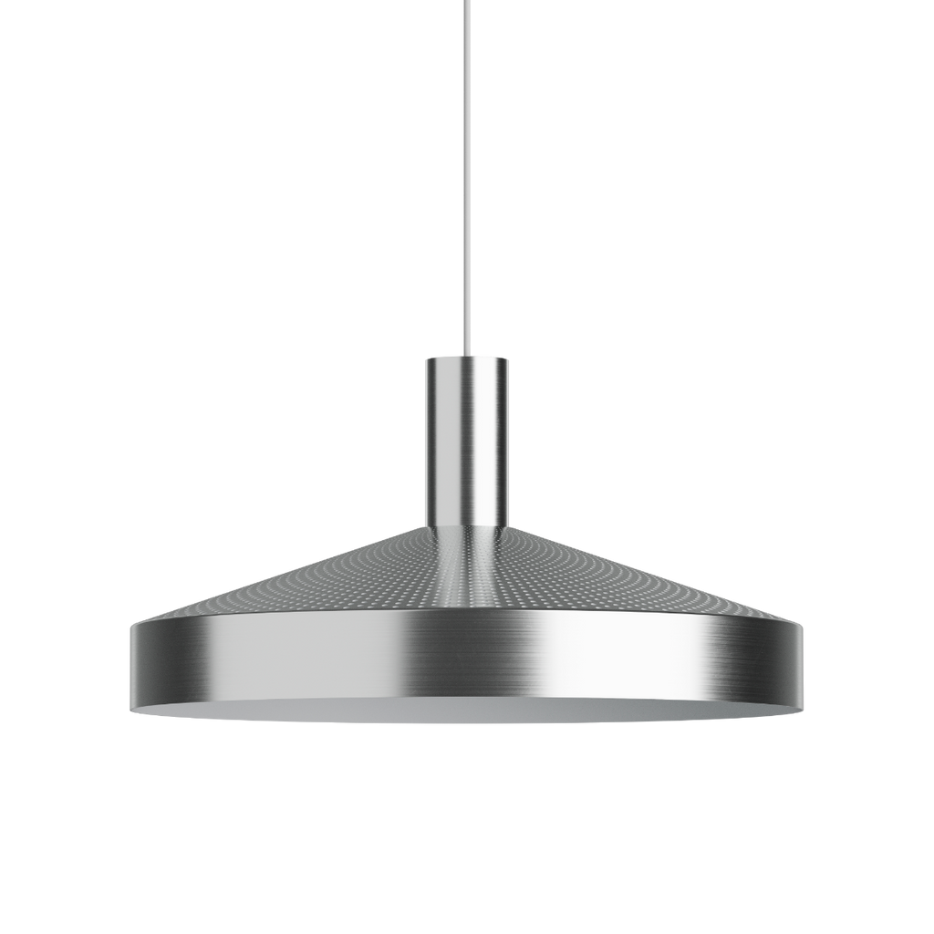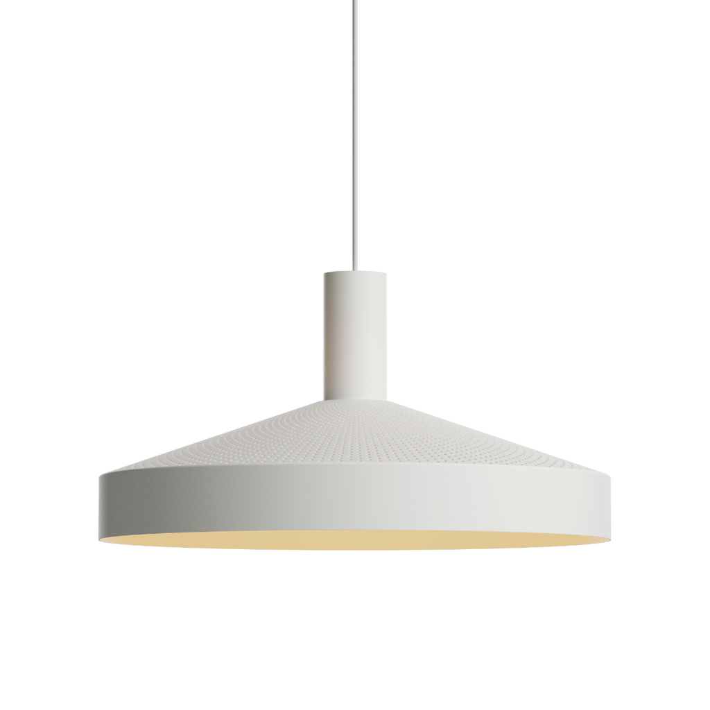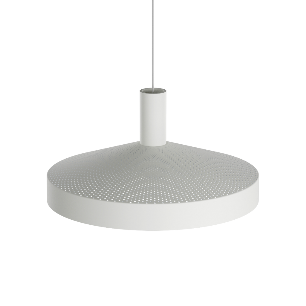 Dawn-pendeln är baserad på den klassiska verkstadspendeln, där en laserskuren perforering i toppen av lampan ger en behaglig och rymlig belysning. Lampans funktionella belysning kommer från den vitmålade innerskärmen och den infällda ljuskällan. Den karaktäristiska böjen i lampans kant ger en mer definierad ljusriktning, samtidigt som perforeringen sprider ljus både uppåt och nedåt.