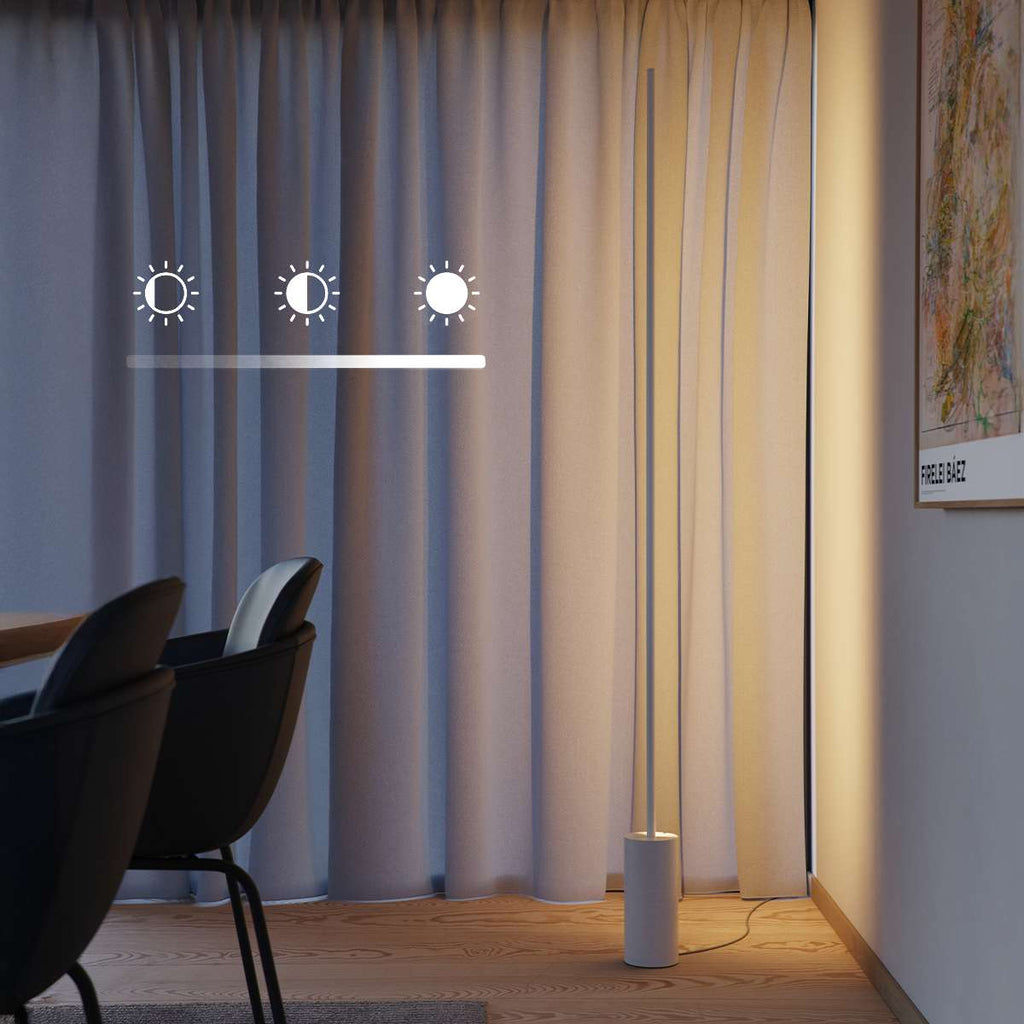 Expo-lampan skapar en mysig belysning och en härlig atmosfär i rummet. Med sitt vertikala ljus ger lampan en unik stämningsbelysning, perfekt som bakgrunds- eller accentbelysning. Ljusstyrkan kan enkelt justeras steglöst med fotpedalen för att skapa den perfekta stämningen.