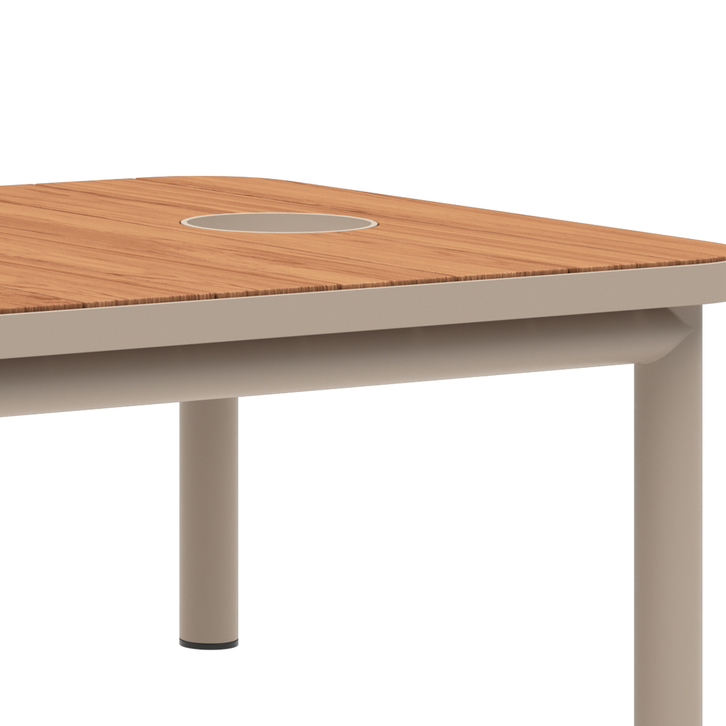 Teakträ har naturligt en hög hartshalt som skyddar träet. Därför kan bordet utan problem stå ute året runt. Bordets aluminiumram säkerställer att bordet inte rostar.
