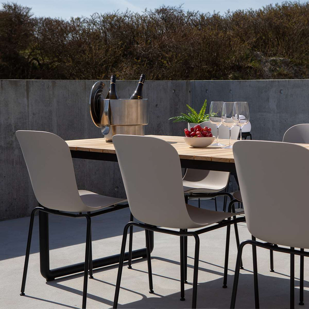 Patio Chair No. One S1 kan staplas eftersom stolsbenen lätt passar runt skalets form.