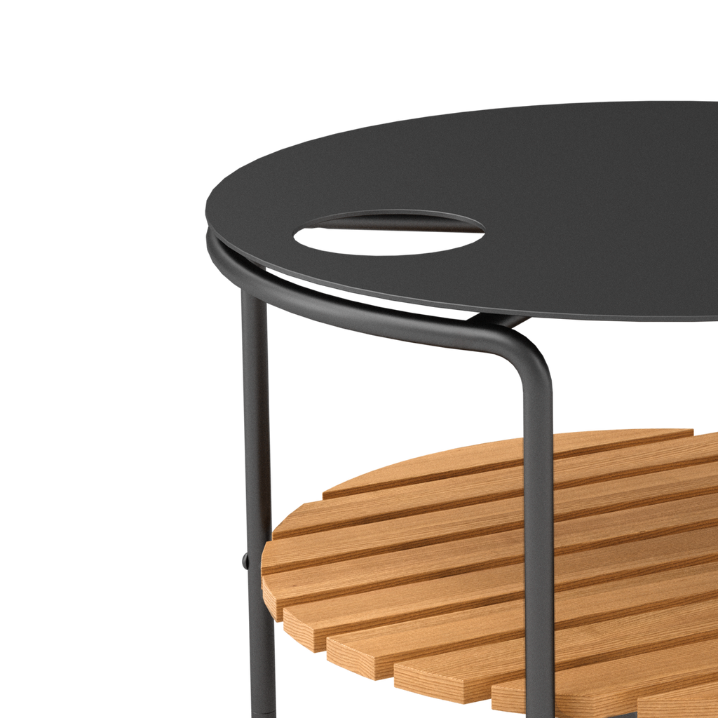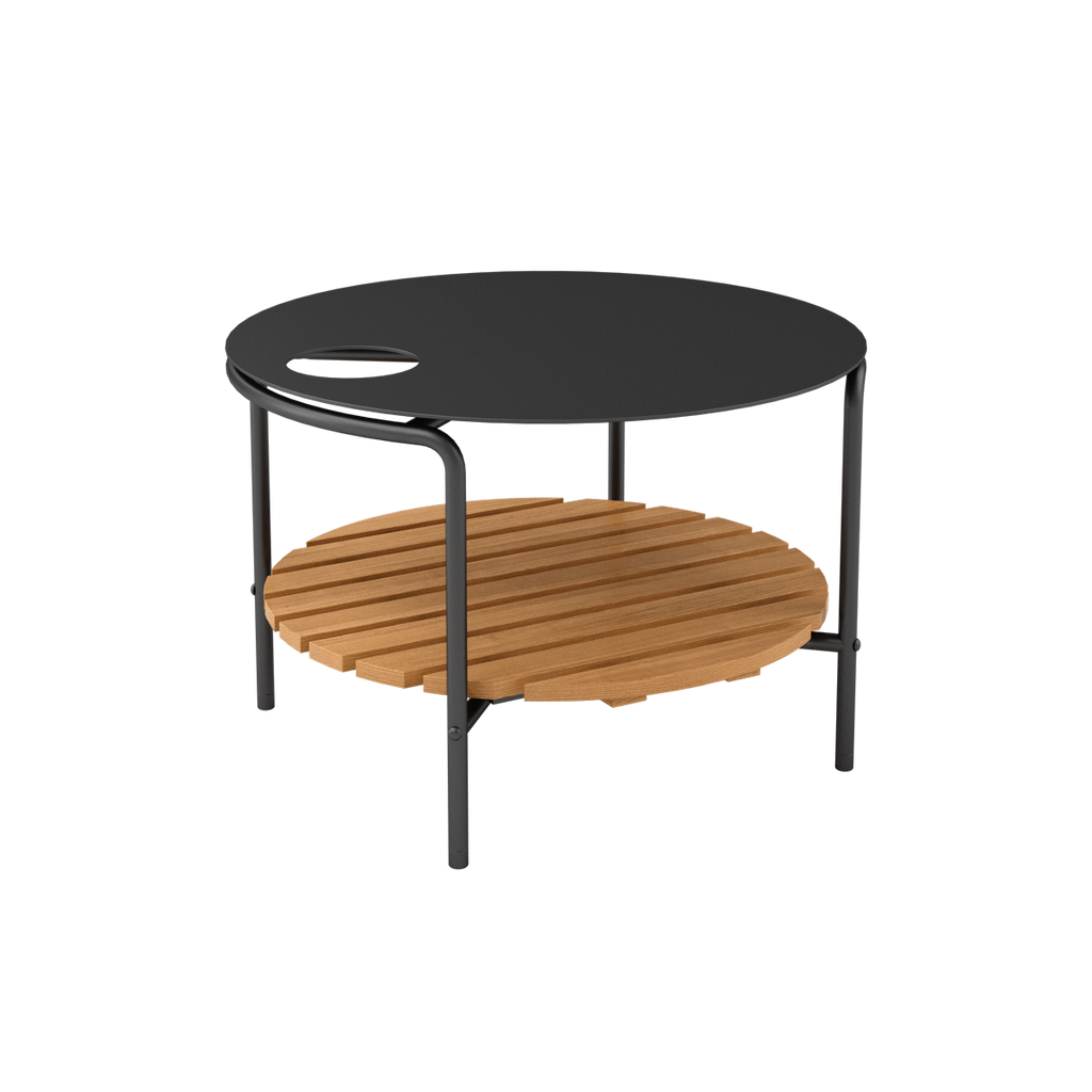 SACKit soffbord till terrassen är ett utomhus soffbord i pulverlackerat aluminium med en hylla under i teakträ. Rena linjer, material i hög kvalitet och en multifunktionell design lyfter din uteplats till en helt ny nivå.